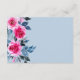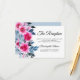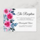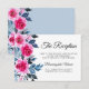 Elegant wedding reception enclosure card design featuring bright pink watercolor roses, blue and grey foliage on a white background. Reverse side of the invitation is in dusty blue colour.