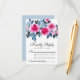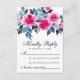 Elegant RSVP card design featuring bright pink watercolor roses, blue and grey foliage on a white background. Reverse side of the card is in dusty blue colour.