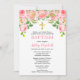 Elegant watercolor vibrantly pink rose floral baby girl Baptism invitation design featuring florals in a top swag type bouquet surrounding your sweet baby's details. A gold tone trinity cross sits below the floral pattern, and the back features a marbled look pink background. This composite floral design is by Holiday Hearts Designs (rights reserved).