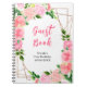 This fun and whimsical birthday party guest book features watercolor pink roses and foliage on a gold geometric frame. The text combines handwritten script and serif fonts for a stylish and modern look. This is perfect for a spring or summer rustic birthday party.