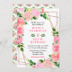 This fun and whimsical wedding invitation features watercolor pink roses and foliage on a gold geometric frame. The text combines handwritten script and serif fonts for a stylish and modern look. This is perfect for a spring or summer rustic wedding.