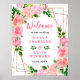 This fun and whimsical wedding welcome sign features watercolor pink roses and foliage on a gold geometric frame. The text combines handwritten script and serif fonts for a stylish and modern look. This is perfect for a spring or summer rustic wedding.