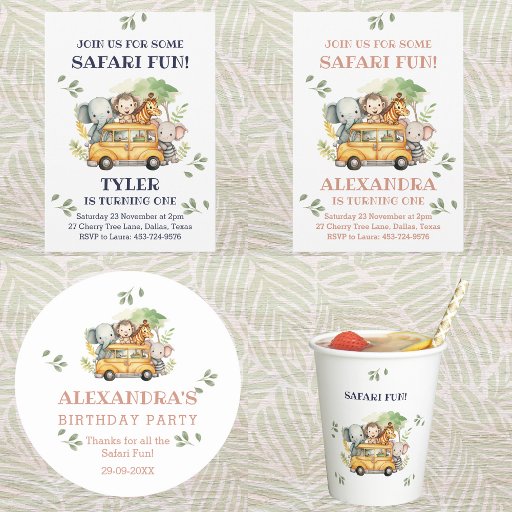 Personalise this Safari Animal Birthday Party Invitation with your Little Girl's Name and invite friends and family to join the Celebration of your Baby Girl's very first roar! It's a Safari Birthday Bash to remember as your little explorer turns One and embarks on her very own Safari Adventure. Get ready to journey through the untamed wilderness filled with Cute Lions, Zebras, and Elephants galore! With Dusty Pink lettering adorning the scenery, it's a jungle paradise fit for your precious birthday girl.