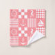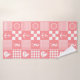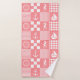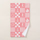 Pink patchwork pattern bathroom towel set featuring geometric checks and stripes as well as seahorses, sailing boats, anchors, and ships’ wheels.