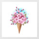 Sweet waffle cone with fresh, pink Japanese cherry blossoms on white background with blue watercolor streaks. Pink Japanese cherry.