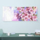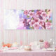 Artistically drawn, branch of pink, cherry blossoms on picturesque, textured background, painted over with white, pink and blue paint. Pink Sakura