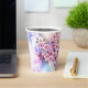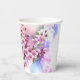 Artistically drawn, branch of pink, cherry blossoms on picturesque, textured background, painted over with white, pink and blue paint. Pink Sakura
