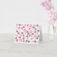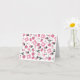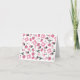A notecard featuring a sewing themed design consisting of a sewing machine, spools of thread, a pin cushion, scissors, fabric swatches, and sewing needles. Design has a pink colour scheme.