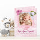 At the heart of the design lies a customisable baby photo framed by an elegant pink border. Adorning the top edge of the frame are delicate flowers and an adorable illustration of baby footprints, adding a touch of playfulness to the design. The bottom of the frame showcases intricately detailed baby booties and a cosy baby hat, symbolising the love and care awaiting your precious bundle of joy.
