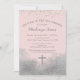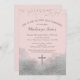 An elegant pink and silver First Holy Communion invitation featuring silver glitter confetti at the top and silver glam bling at the bottom with a silver glitter cross.