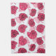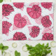 Pink snails kitchen towel with a pattern created from an ink drawing of abstract snail shells with decorative white dots in from of leaves.
