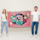 Beautiful Christmas holiday throw features three adorable penguins in ice skates, sweaters, striped scarves, and winter hats on a background of pink and black with snowflakes and polka dots of white and an area you can easily personalise with your family name!