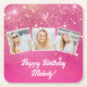 Pretty pink sparkles decorate these cute custom photo collage birthday party coasters for a woman, teenager, or little girl who loves sparkly glam gifts. Personalised happy birthday gift with 3 photographs over a hot pink girly background.