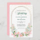 A double oval gold frame is decorated with pastel pink flowers and soft green leaves at the bottom of this pretty wedding invitation. Your custom text is in matching green and gray in the center. The top third also has a sparkling gold confetti spray. The images and text are placed on an elegant white background. The back of the invitation is matching pastel pink, with the same confetti overlay. Beautiful, modern, and chic! *Thanks to LABF Creations for the floral images in this design.