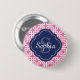 A bright pink and white interlocking square chain pattern background with a navy blue quatrefoil label frame featuring a customisable name and monogram template. Monogrammed colourful, chic, trendy, geometric pattern.