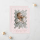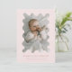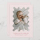 Whimsical and sweet birth announcement card featuring hand drawn photo frame of squiggly wavy line. Pink background.