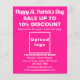 Pink flyer for St. Patrick's Day that you can customise by specifying the discount percentage, sale dates, uploading your business logo, typing your business name, address, phone number, email and website. Customise it and distribute it to attract more customers to buy your products or clients to like your services. Please check the appearance of the front and back sides after uploading logo and typing texts. If the appearance is pleasing to you, you can place your order now. If you need to resize and reposition the logo and texts to fit on this flyer or on the size that you've chosen, please adjust in the design tool. You can also change the background colour, font colour and font style in the design tool. Happy St. Patrick's Day! Wishing you the best of luck, joy and more sales this holiday.