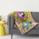 A quality printed throw has its advantages. This is a much finer weave throw than its loopier cousins, and though lighter, it is worth the investment for custom room accessorizing. The back is much prettier than the typical brown, and the fringe on the long sides very vivid, the selvage nicely done. Before photographing, I washed the throw in cold water, delicate, with a thicker woven throw the same size. On tumble dry low, this throw was dry in half the time as the other. This is a very practical quality if you use throws for furniture covers or to wrap up in frequently. The sleekness of the fabric makes it a great layer for accenting or protecting without the feeling of sitting on too much stuff. Perfect for napping or when you feel a light chill coming on. The color printing is beautiful and on this fabric, matched the design and color of my Photoshop image. This is an advantage for blending room fabrics and colors. The fringe on the short sides prints the colors from the design image and therefore varies from the side fringe. I streaked a white fractal line through the plaid pattern to give the illusion of weaving. This printed as crisp as an illusory thread, and put some white in the short side fringe, showing another advantage of print vs loomed- for artistic purposes, line lines, detail, and color integrity can be planned and preserved. My loomed throws have color limitations and more of a needlepoint texture. Print throws reproduce an exact image. The throw felt a little stiff straight out of the package, but this went away in the first delicate wash. Of course I searched the wash water for ink or bleeding and there was none.