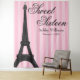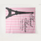 A trendy Paris themed sweet 16 backdrop tapestry. Featuring an Eiffel tower illustration on a pink stripe pattern background.