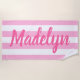 Sweet pink and white stripes make this personalised beach towel a favourite for girls and teens. A large flowing script monogram name adds a fun, custom touch to the classic striped design. All text and colours are fully editable to add any name and adjust the stripe colour. A pretty and practical summer essential for the pool, beach, lake, and camp.