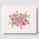Pretty baby shower or bridal shower guest book with graphics of a pink and white horizontal striped background. Watercolor pink peony floral decoration, on the front of the book, has a pink disc with custom text. Personalise the text fields for your special day.