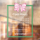 Give your store front a coquette touch with an open hours window cling with an illustration of a striped bow in pink and white on a green frame. Personalize the window cling with your store's opening hours or your salon's opening hours. Add phone number and website too so your customers and clients know where to book an appointment or get more information about your small business. The fonts are easy to read, but still cute and matching the overall vibe. The perfect opening hours window cling for cute boutiques, beauty salons, hair salons, pet groomers, candy stores, ice cream shops, and more!