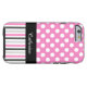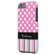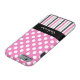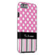 Stylish iPhone 6 case, with a pink and white polka dot pattern, on the top and a dark grey, pink and white striped pattern, on the bottom. A black band runs across the case between the two pattern, with white custom script text ready to personalise. Pretty way to protect your iPhone 6 and look stylish too, and makes a great personalised gift idea.