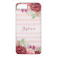 This personalised iphone cover features a blush pink stripes with watercolor burgundy and blush peach roses and flowers. Personalise it with a name.