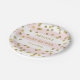 Customisable name baby shower party plates in light pastel pink and white stripes pattern with gold confetti, please note gold is photographic effect only.