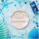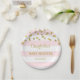 Customisable name baby shower party plates in light pastel pink and white stripes pattern with gold confetti, please note gold is photographic effect only.