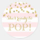 Pink Stripes Gold Confetti She's Ready to Pop Classic Round Sticker