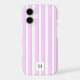 A monogram phone case with a block letters on a background of pink stripes in light pink, dark pink and white.