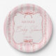 Pink stripes retro bow border elegant baby shower monogrammed paper plates, pastel pink baby girl baby shower personalised paper plates, retro stripes baby shower personalised paper plates, baby girl baby shower personalised table decor printed paper plates