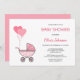 Invite your friends and loved ones and celebrate your pregnancy with this stylish baby shower invitation which features a pink pram and heart-shaped balloons indication the exciting expectation of a baby girl.