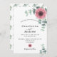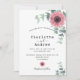 A chic white background. Decorated with pink watercolored sunflowers, florals and eucalyptus greenery. Personalise and add your names and wedding details. Black letters.
