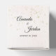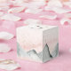 This Pink Sunrise Mountain wedding square favour box brings a classy and unique, yet simple and casual touch to your wedding. The sunrise and sunset shades of pink, mauve, peach, blush, coral and dusty rose, kissed with starry gold glitter around the styled calligraphy text brings a peaceful, minimal nature to the watercolor painted grey mountains for a mountain themed marriage celebration.