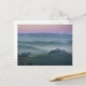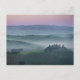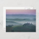 Postcard of a foggy sunrise with a pink sky and mist between the Tuscan hills over agriturismo podere il Belvedere farmhouse in the Valdorcia (Orcia Valley) between Pienza and San Quirico in Tuscany, Italy.