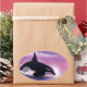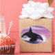 Digital painting of an orca breaching in front of a pink sunset.