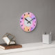 A wall clock with a doughnut look and a pink prism background.