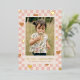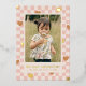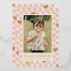 A foil Valentine's Day card with tan hearts scattered over a pink chequerboard design. The message and customer information is placed beneath a large photo, and the back of the card features a coordinating pattern.