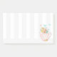 Landscape orientation post it notes with a whimsical illustration. A pink teapot with a little pink heart in the centre and a bouquet of flowers inside. Delicate pastel coloured butterflies fluttering about. Set on a grey and white striped background.