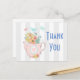 A thank you postcard with a whimsical illustration. A pink teapot with a little pink heart in the centre and a bouquet of flowers inside. Delicate pastel coloured butterflies fluttering about. Set on a grey and white striped background.
