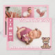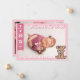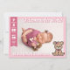 Baby girl photo birth announcement personalised with several photos, a larger photo on one side and four more on the back against a baby pink background. A teddy bear with a pink bow tie and a pink bow at the ear in one corner as a cute overlay on the photo of your newborn daughter. Her birth stats against a pink label where you can write down height, weight, time of birth, and date.