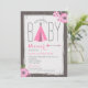 A modern baby shower invitation featuring an illustration of a pink chevron tipi, and arrow, and flowers. Background is wood inspired. Personalise the text.
