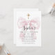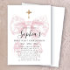 Feminine and pretty pink toile bow creates a sweet background for a girls first communion invitation. A gold cross is placed above the bow. Your daughter's name is written in a beautiful calligraphy script. All text is editable.