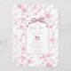 Elevate your baby shower celebration with our exquisite pink and white floral toile invitation, featuring a charming toile de jouy pattern. This elegant piece showcases a coquette bow and a delightful rocking horse. Perfectly crafted to set a sophisticated tone for your event, this invitation not only conveys your joyous occasion but also adds a touch of timeless elegance that your guests will adore. Make your baby shower unforgettable with this stunning invitation that reflects both style and grace.