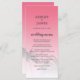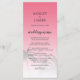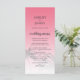 Elegant destination wedding menu with a tropical palm tree design on a bright pink background featuring elegant script and modern typography. The sunset pink fades onto a white background. Simply add your wedding details to this stylish tropical beach wedding menu. Exclusively designed for you by Happy Dolphin studio.