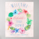 Custom modern watercolor baby shower welcome sign poster in washed blush pink shades with a colourful Hawaiian style hibiscus floral wreath. Perfect for a modern summer Hawaiian luau, aloha beach, seaside, oceanfront, coastal, tropical, nautical or destination themed baby boy or girl or gender reveal shower party.