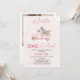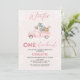 Sweet winter onederland themed girl's 1st birthday invitation featuring a pink truck, pine trees, woodland animals and snowflakes on a pink background and a photo on the back. Great for a girl's winter themed first birthday party.