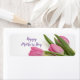 These labels have three pink tulips in the lower right corner. Purple script is available for personalised text (currently reads: 'happy mother's day'). Text can be edited or deleted.